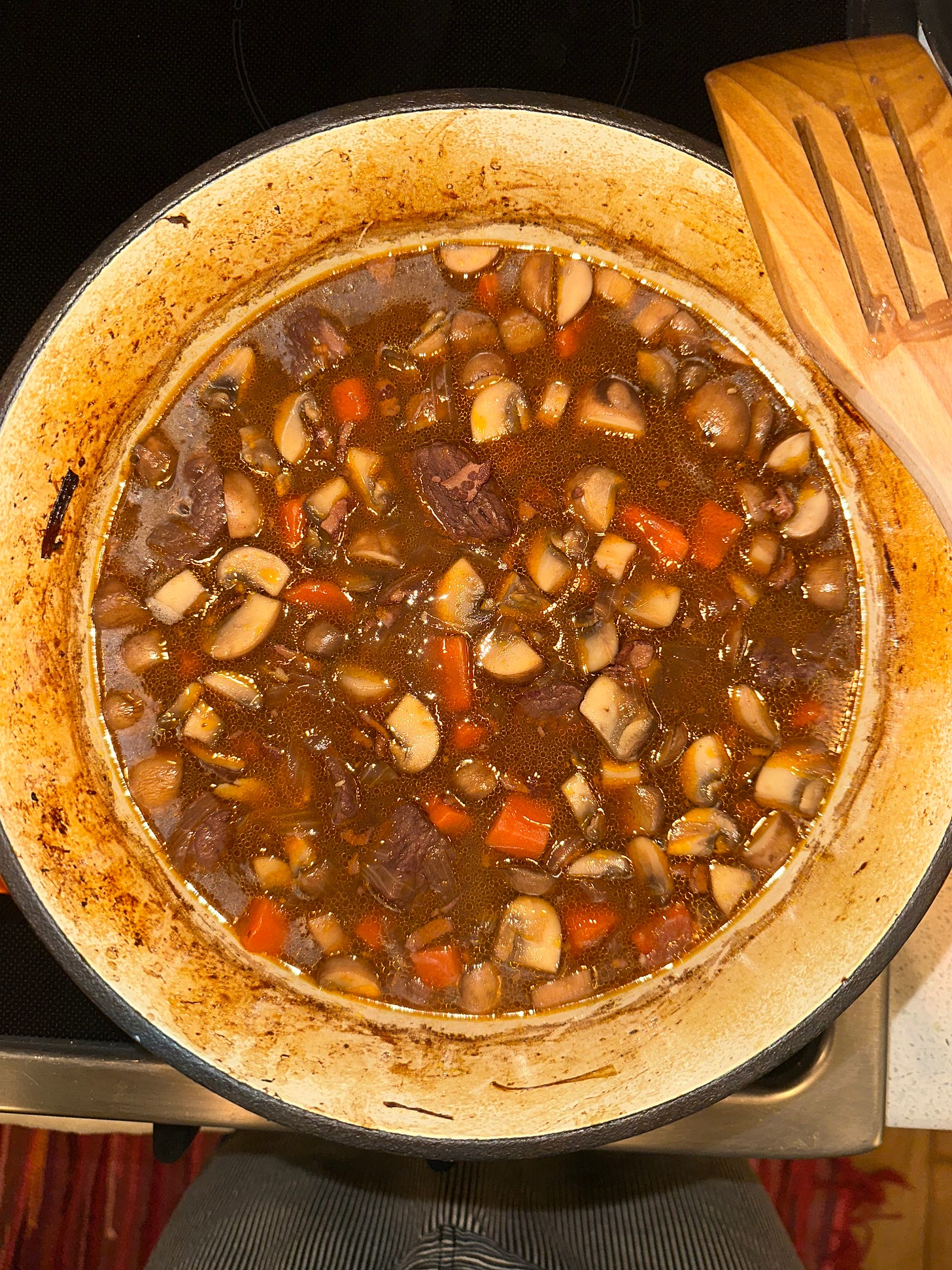 This dish normally includes pearl onions, but I can never find them at the grocery stores around me so they’re not here. Make them separately and add them later like the mushrooms.